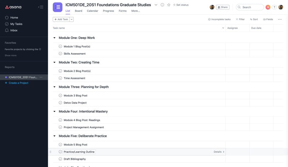I listed every weekly module, and their perspective assignments inside of Asana. The software is very easy to use, and I was able to list out the modules and create sub lists to add assignments to each entry. The process was very easy and straight forward and has allowed me to create a timeline of all my work past and current for this course. Having the ability to see what is due and when helps keep my pace of work consistent. This is important because staying on top of work, or even finishing work before a due date will diminish any stress of waiting