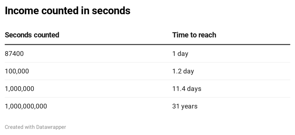 So, let’s put 1 billion dollars in perspective. It’s hard to imagine several past a certain amount, and things start getting pretty crazy once we enter the millions range in most of our minds, but the different between a million and a billion is absolutely staggering. Most of us can count our salaries in a single day. It might take half the day, or a full day of non-stop consecutive counting, but even if you make over 100k, don’t expect to even count for more than 2 days if it was possible to count non-stop every second for entire 24-hour periods. Spoiler alert: It’s not. But say it was possible, this is how it would break down.