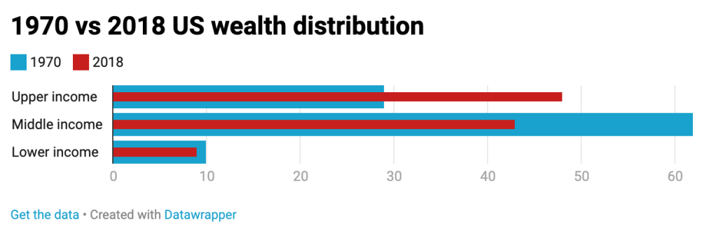 Throughout the decades, the poorest 50% of the country has seen its wealth remain stagnant or even fall while there has been a steady increase in the top 20 percent or earners with the middle class shrinking in size at the same time. The pandemic has only added to that disparity with an additional 10% increase in wealth to the top 1% of earners. “Between 18 March and 10 April 2020, over 22 million Americans lost their jobs. Over the same three weeks, my co-authors and I find in a new study for the Institute for Policy Studies, US billionaire wealth increased by $282 billion — an almost 10 percent gain”. (Collins)