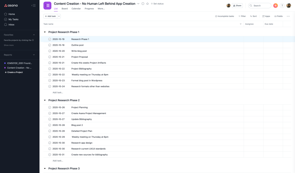 Next, I created an Asana project management page where I can track my progress with this project, as well as show project superiors (or in this case my professor) how and when my work is getting done. The logic behind my workflow is to break the work down by research design and prototyping phases. The first 3 weeks are for research and every week I will gather new sources and annotate those sources. The design phase will include wire framing work and initial designs while the prototyping phase will be designing and linking 20+ screens together to create a mock up of how the app will actually look and function with the ability to click through. The purpose of this project is to create a high fidelity mock up/prototype of an app that can not only accomplish all of the business goals set by the company, but to also create a great user experience for those who will use it the most.
