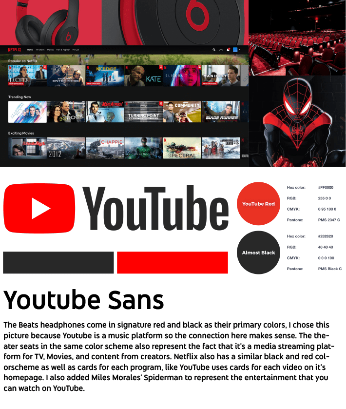 The mood board I made reflects contains pictures that I think reflect what YouTube does and is used for. While according to Plutchik’s Wheel of Emotions, the color red signifies negative emotions, I believe it lends itself to being Visceral and giving users that feeling that they are using something fun and sleek. I brought in the YouTube Sans type face as well, and wanted to convey everything that YouTube is using the images I chose.