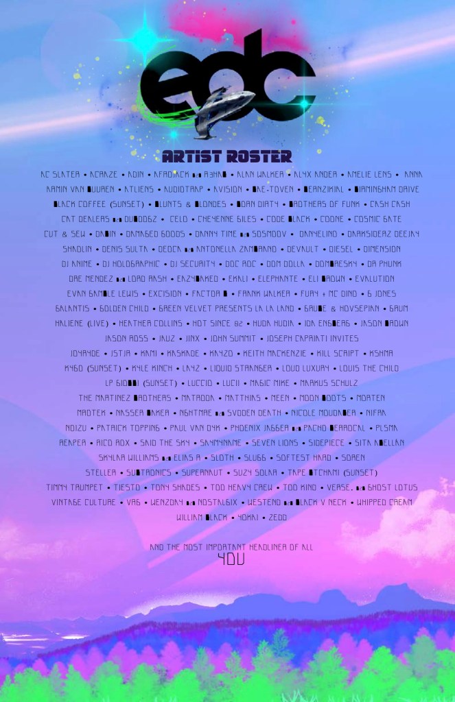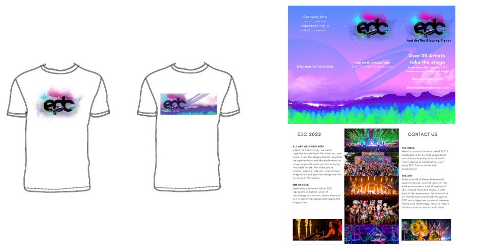 For this project I chose EDC Orlando, as that is where I live and wanted to create my own take on this visually appealing and exciting music festival. I chose to create the event campaign creation for the 2022 festival season because I wanted to place it in the future but not too far off. I want to give it more of a sci-fi feel this time around while keeping the awesome glowing flora, and the colorful and inviting ambiance that EDC is known for creating for their promo materials and visuals.