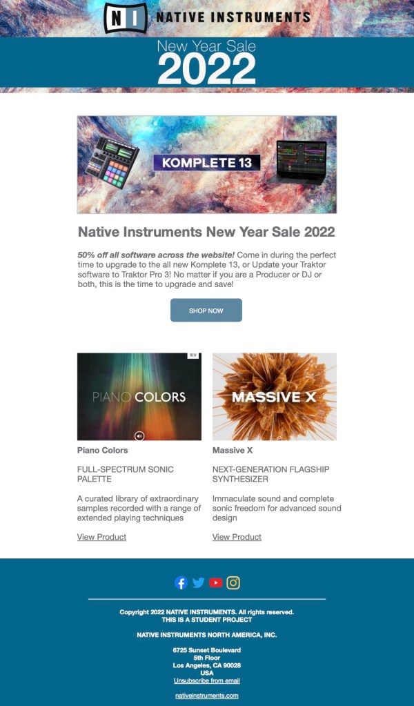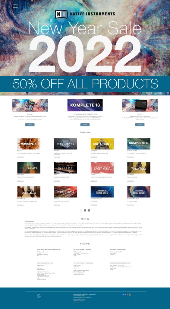 For this promotional email and special sale one-page website, I decided to create a campaign for a “New Year 2022” sale, which features 50% off on all digital products across their store. Native Instruments is known for their flash sales especially during the end/beginning of the year and during the holidays.