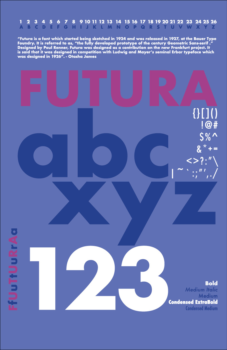 Continuing my work, I created a Type specimen poster. These posters show off typefaces by displaying different characters and styles using a specific typeface. For this project, I chose Futura as the classic font I used for this project. In this project I chose to use two colors, as well as white to create the poster. I wanted to highlight both lower case and capital letters, numbers, symbols and everything that showed the range of the font that I chose. Considering this is the first type specimen poster I have created (I have been in design for a decade almost) I was excited to create something with my own unique style to it.