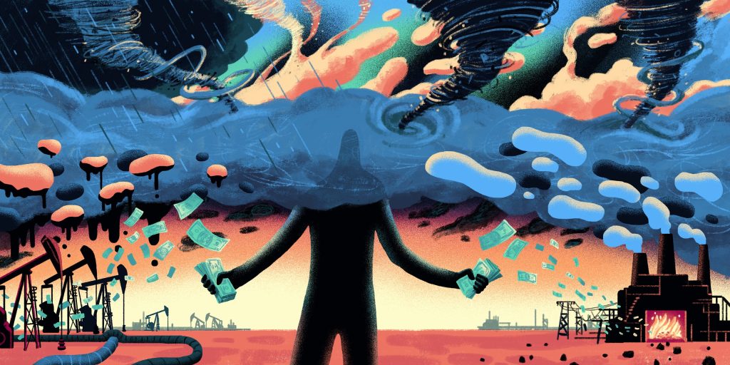 This image is telling a story. It’s an illustration that explains how humans, while fully aware of climate change and global warming, have been slow to change or create green technology that can replace the oil and gas industry because of the political and economic ties involved in that business. There are multibillion dollar corporations who’s main product is oil and gas and those corporations have lobbied politicians not only into keeping oil and gas as the main energy resource in developed countries, but have even sought their help in cleaning oil disasters they started such as the oil spills in the Gulf of Mexico that have devastated coastal towns and cities along the states that border the gulf. The image almost feels like humanity has a decision to make when it comes to global warming, and it’s one that will affect us all in the long run.